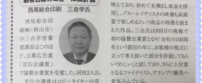 株式会社瀬戸内海経済レポート様が発行する岡山の経済情報誌「VISION OKAYAMA」(3月28日号)に、公募広告賞「第59回宣伝会議賞」にて協賛企業賞(パナソニック様)を受賞した弊社営業部 三吉学の記事が掲載されまし…